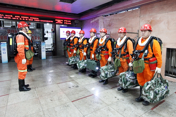 6時50分,演練以1010-1工作面第5~20架頂板淋水成線,水色混濁且含砂,有突水潰砂征兆為背景,正式開始。在接到事故報告后,現(xiàn)場立即啟動《突水潰砂事故應(yīng)急預案》,成立應(yīng)急救援指揮部,緊急調(diào)度救護隊員和醫(yī)護人員出動,趕赴現(xiàn)場待命。
